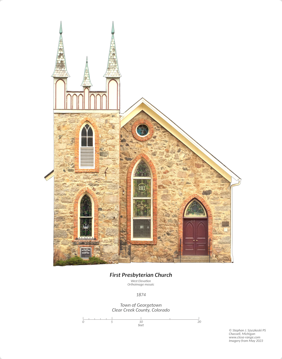 Constructed adajcent to Clear Creek in Georgetown Colorado, this church has been in continuous operation since its dedication Sept. 20, 1874. First Presbyterian Church has a long record of supporting Georgetown and Clear Creek County. In the 19th century, the Little Willing Workers Society, made up of young girls, patched quilts to raise money for good works.